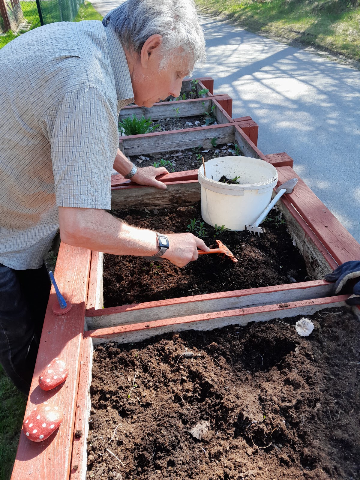 Vi har promenerat en hel del på förmiddagen innan solen blivit för het. Vi dricker mycket vatten och äter chips för att få i oss lite salt i värmen. Vi har naturligtvis löst några korsord, spelat Fia och haft frågesport ute. En dag passade vi på att rensa våra lådor och satte ner frön så nu hoppas vi på riklig skörd. Vi har även börjat vänja våra plantor med att komma ut i friska luften innan dem får flytta ut permanent.